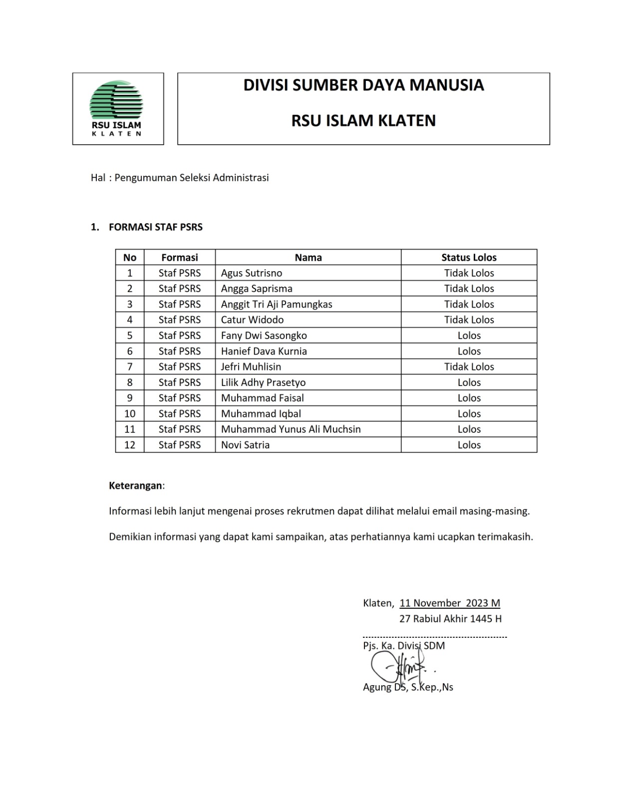 PENGUMUMAN SELEKSI ADMINISTRASI STAF PSRS
