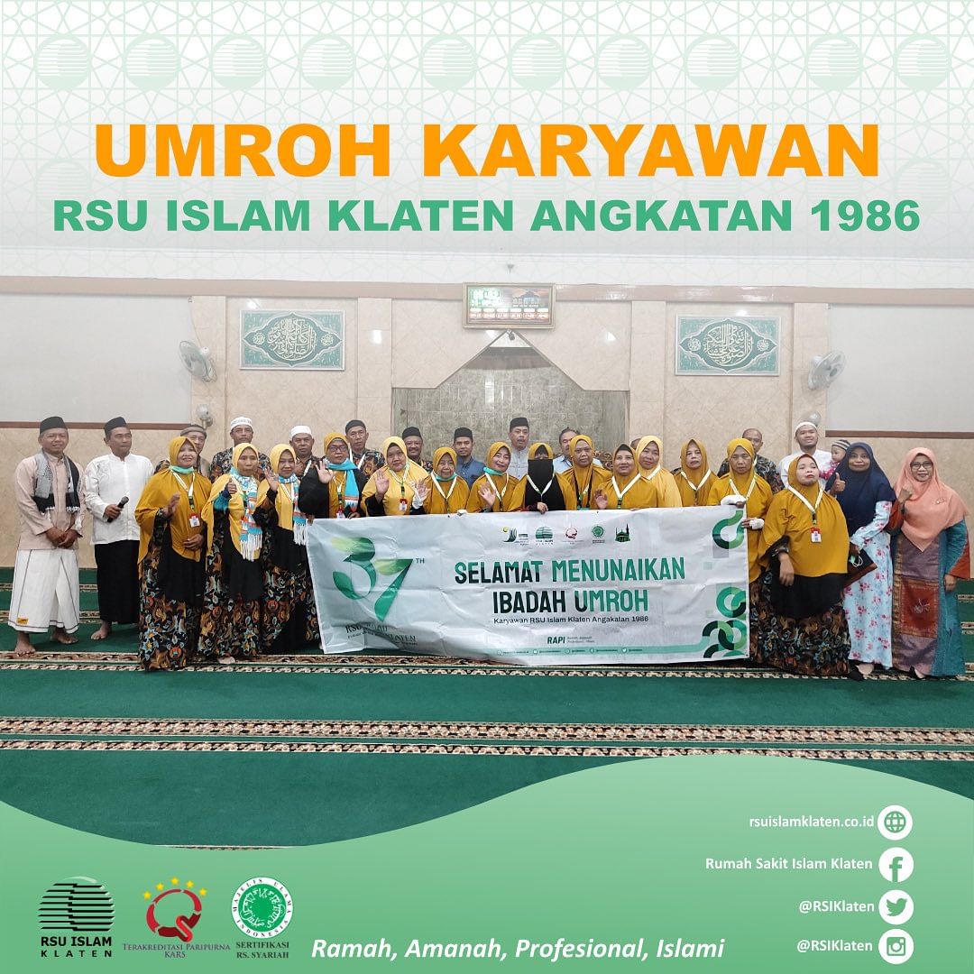 Alhamdulillah, dalam momen Milad Ke-37 ini RSU Islam Klaten bersyukur atas kesempatan yang diberikan oleh Allah SWT untuk mengirimkan 16 karyawan RSU Islam Klaten Angkatan 1986 untuk menunaikan ibadah umroh. Para karyawan tersebut merupakan para perintis RSU Islam Klaten. Kami berterima kasih kepada semua pihak yang telah mendukung dan mendoakan keberangkatan para Karyawan. Semoga Allah SWT menerima amal ibadah mereka, mengampuni dosa-dosa mereka, dan memberikan kesehatan, kebahagiaan, dan kebaikan bagi para keryawan dan keluarga. Aamiin