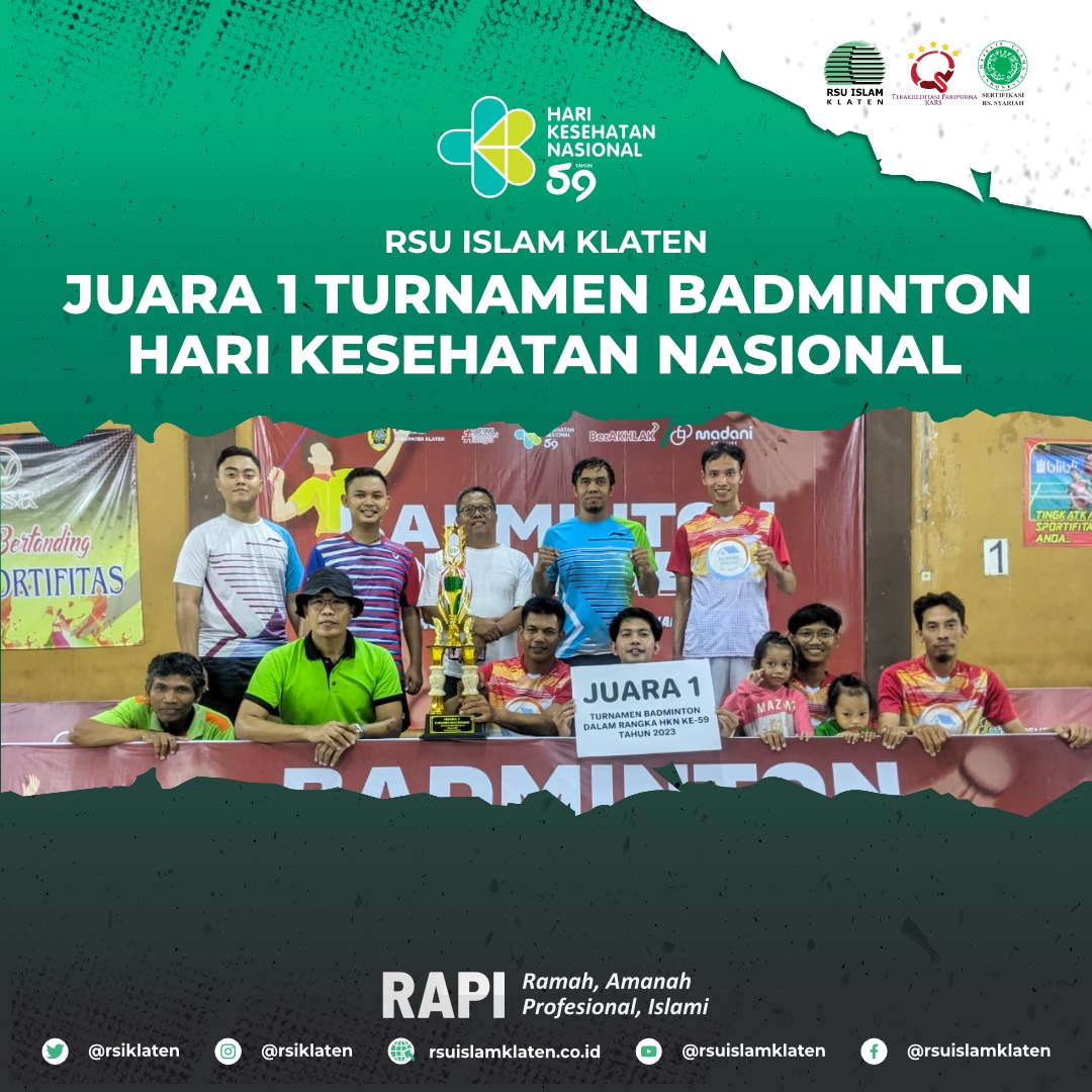 Selamat kepada tim badminton RSU Islam Klaten yang berhasil meraih juara 1 lomba badminton dalam rangka Hari Kesehatan Nasional Ke-59 di Kabupaten Klaten. Sebuah prestasi yang membanggakan dan menunjukkan semangat olahraga yang tinggi dari para karyawan RSU Islam Klaten.