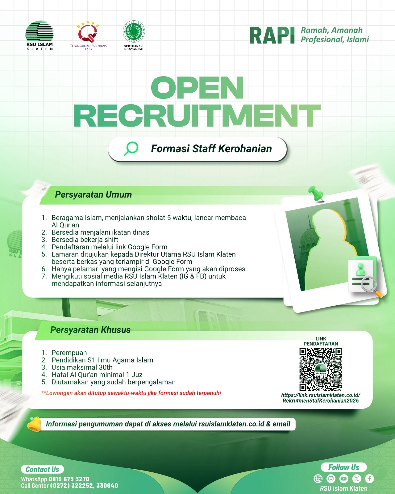 Bergabung dengan Staf Kerohanian RSU Islam Klaten berkontribusi langsung dalam memberikan pelayanan holistik berbasis syariah untuk pasien dan keluarga.