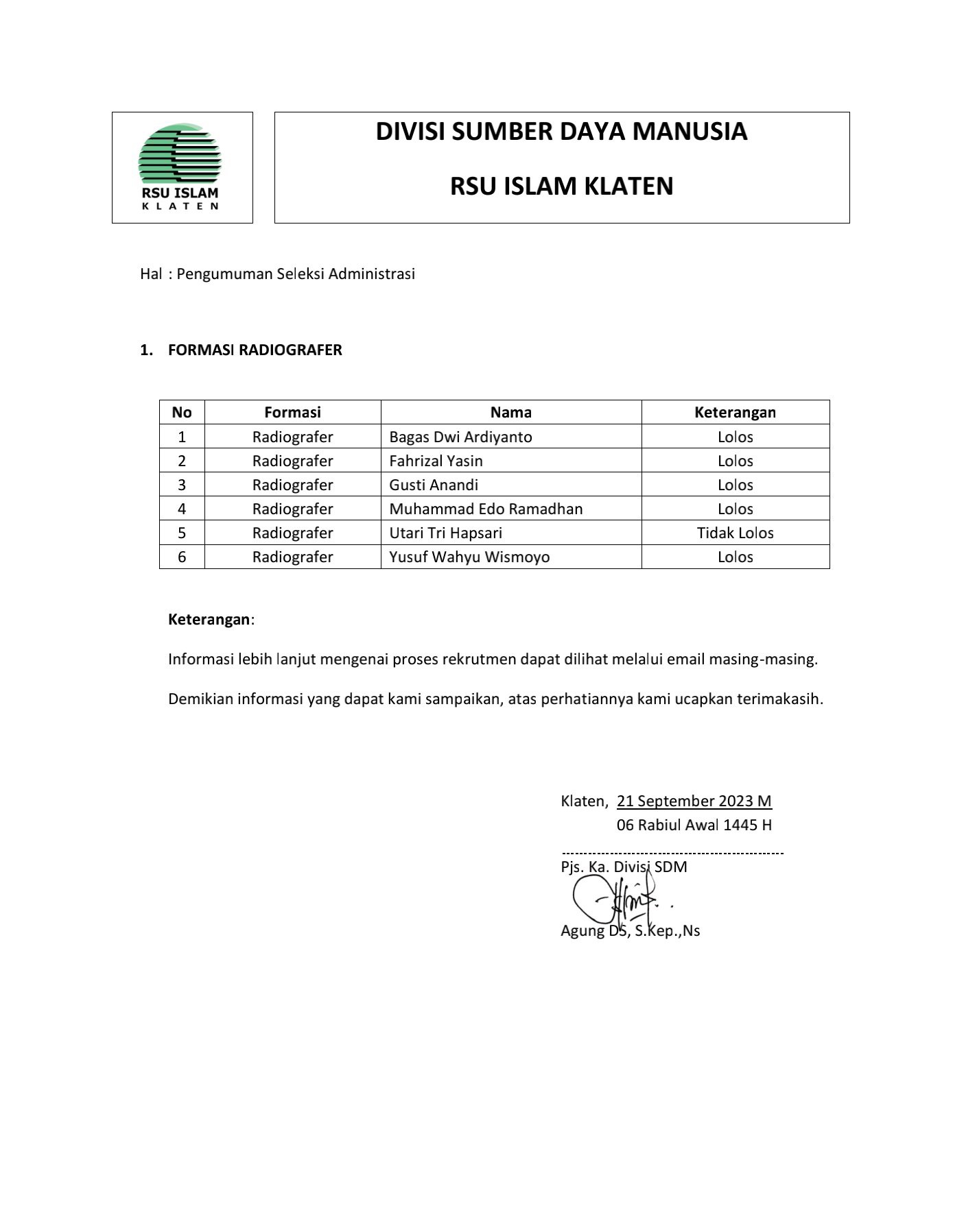 HASIL SELEKSI ADMINISTRASI RADIOGRAFER