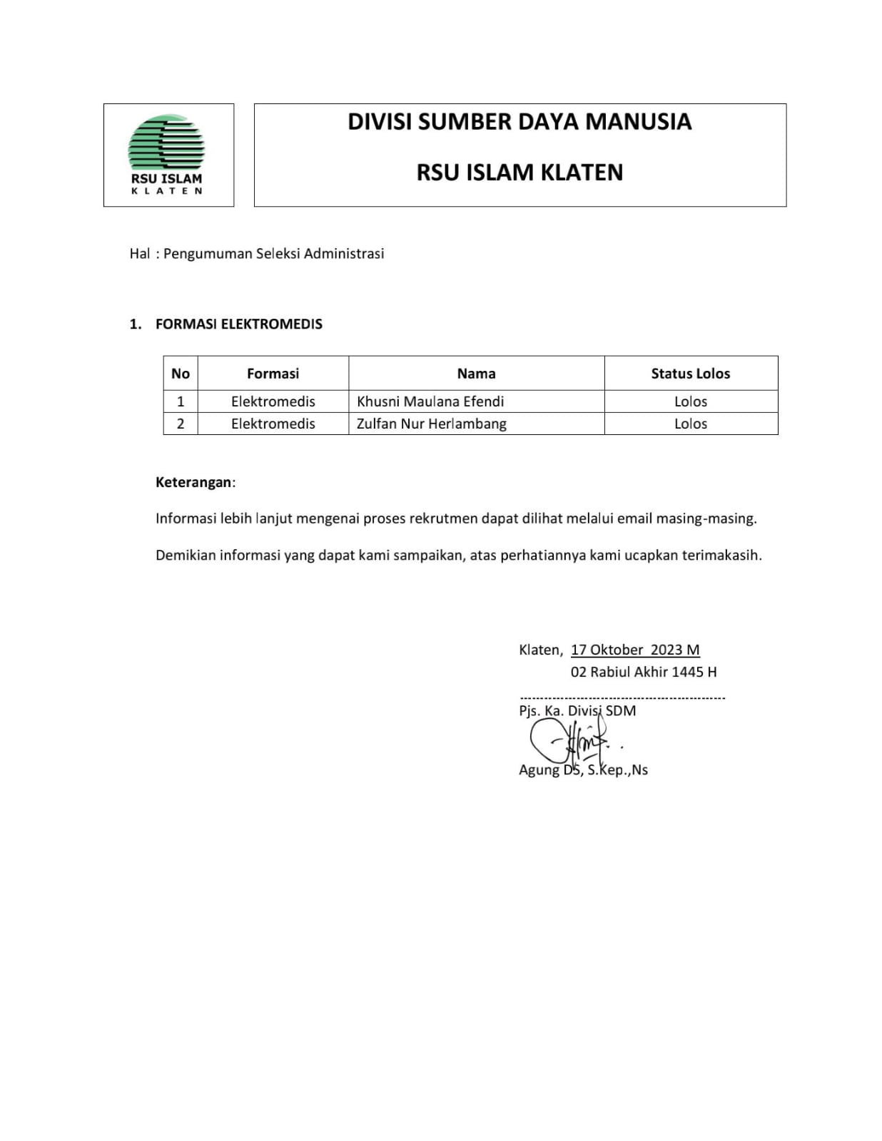 PENGUMUMAN SELEKSI ADMINISTRASI REKRUTMEN ELEKTROMEDIS Diposting pada: 17-10-2023 Kembali ke Daftar Pengumuman